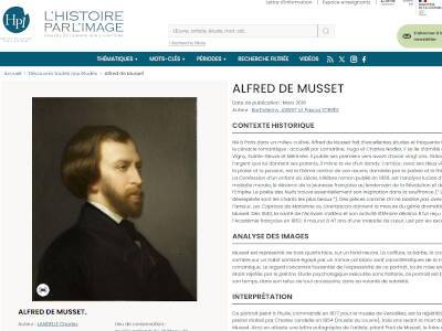 Cette étude du site "L'Histoire par l'image" présente la vie et l'oeuvre d'une figure majeure du romantisme, Alfred de Musset, à travers un portrait réalisé par Charles Landelle (conservé au Château de Versailles). L'étude se compose de trois parties : - le contexte historique qui permet de situer l'époque dans laquelle s'inscrit l'oeuvre, - l'analyse de l'image décrit l'oeuvre et dégage la signification des éléments offerts au regard de l'observateur, - l'interprétation met en évidence l'apport historique de l'image. (d'après www.histoire-image.org)