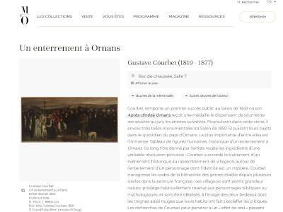 Le musée d'Orsay présente "Un enterrement à Ornans" de Gustave Courbet. C'est à la fin de l'été 1849 que Courbet s'attaque à son premier tableau monumental. Il souhaite en faire son "exposé de principe" et exprime son ambition en intitulant l'oeuvre "Tableau de figures humaines, historique d'un enterrement à Ornans". Une bibliographie, placée en "Notice détaillée" complète cette présentation. (D'après www.musee-orsay.fr)
