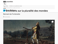 Après avoir composé plusieurs ouvrages dans des domaines très variés (poésie, théâtre, philosophie), c'est avec les Entretiens sur la pluralité des mondes , publié en 1686, que Fontenelle connaît le succès et la gloire. Esprit enjoué mais aussi véritable homme de science, Fontenelle se donne l'objectif de vulgariser les théories astronomiques de Descartes sous une forme attrayante.